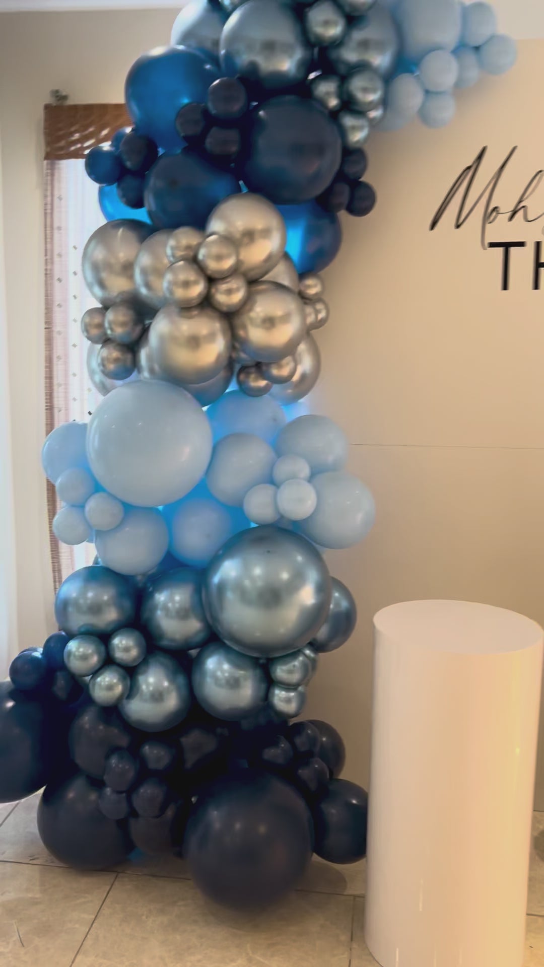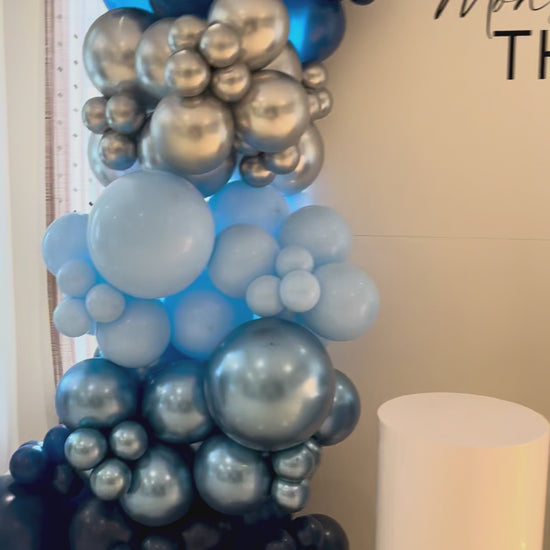 - Two balloon garlands (large & small) in blue, silver & navy shades