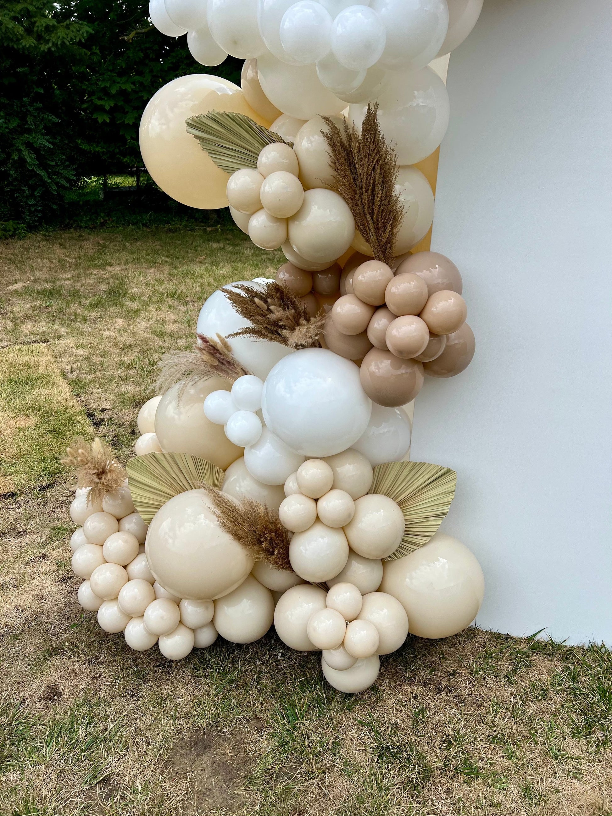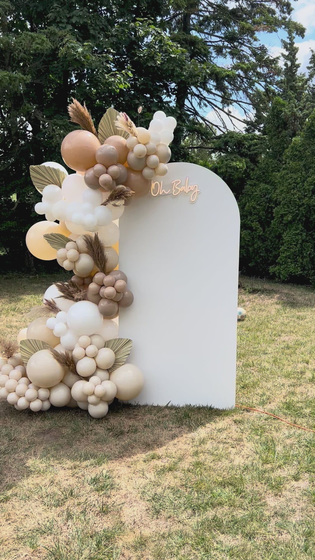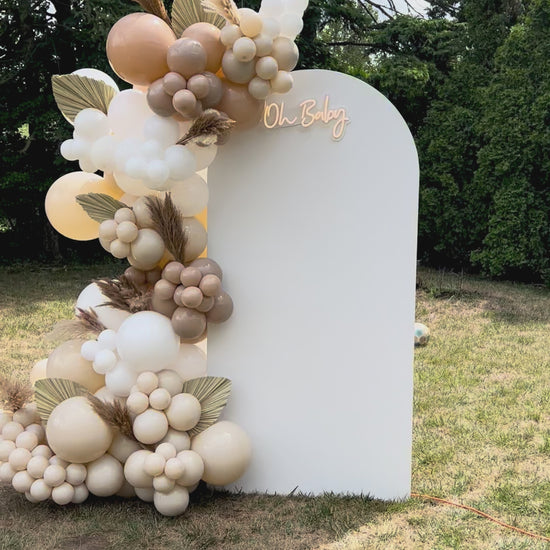 Soft, natural, and effortlessly stylish — this Beige Boho Oh Baby setup brings a warm, organic vibe to your baby shower. It features a white oval backdrop with a glowing Oh Baby neon sign and a beautifully arranged balloon garland in gentle shades of white, beige, and light brown.