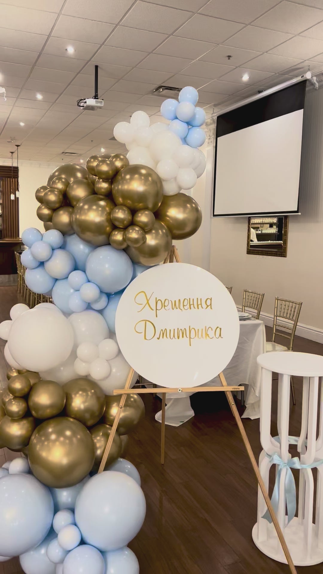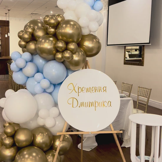 This design features a round sign displayed on an easel, paired with a 6ft balloon garland woven around the stand, along with a styled cake table to complete the look.