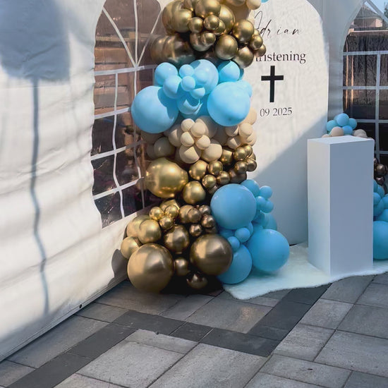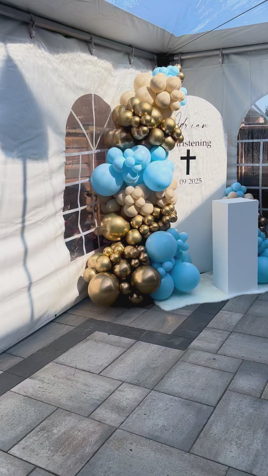 A bright and elegant baptism setup designed for a boy — featuring a white oval backdrop with a custom inscription, complemented by two balloon garlands on each side (one large and one small) in soft shades of blue, cream, and gold. The look is completed with a square cake table and a soft white fluffy floor mat, creating a cozy and refined atmosphere.