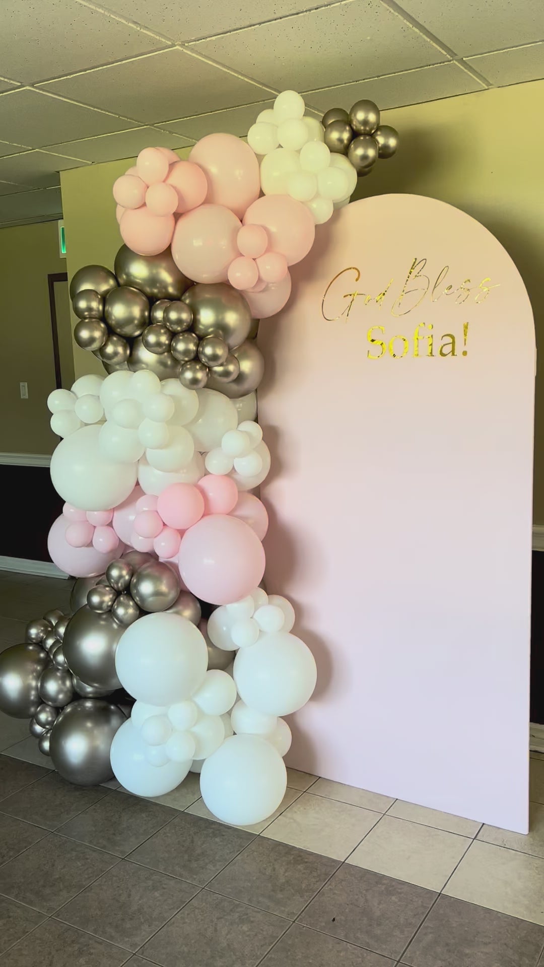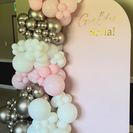 A soft and graceful baptism setup designed for a baby girl — featuring a blush pink oval backdrop with a custom inscription and a delicate balloon garland in white, gold, and soft pink tones. A timeless and elegant look perfect for a christening celebration.