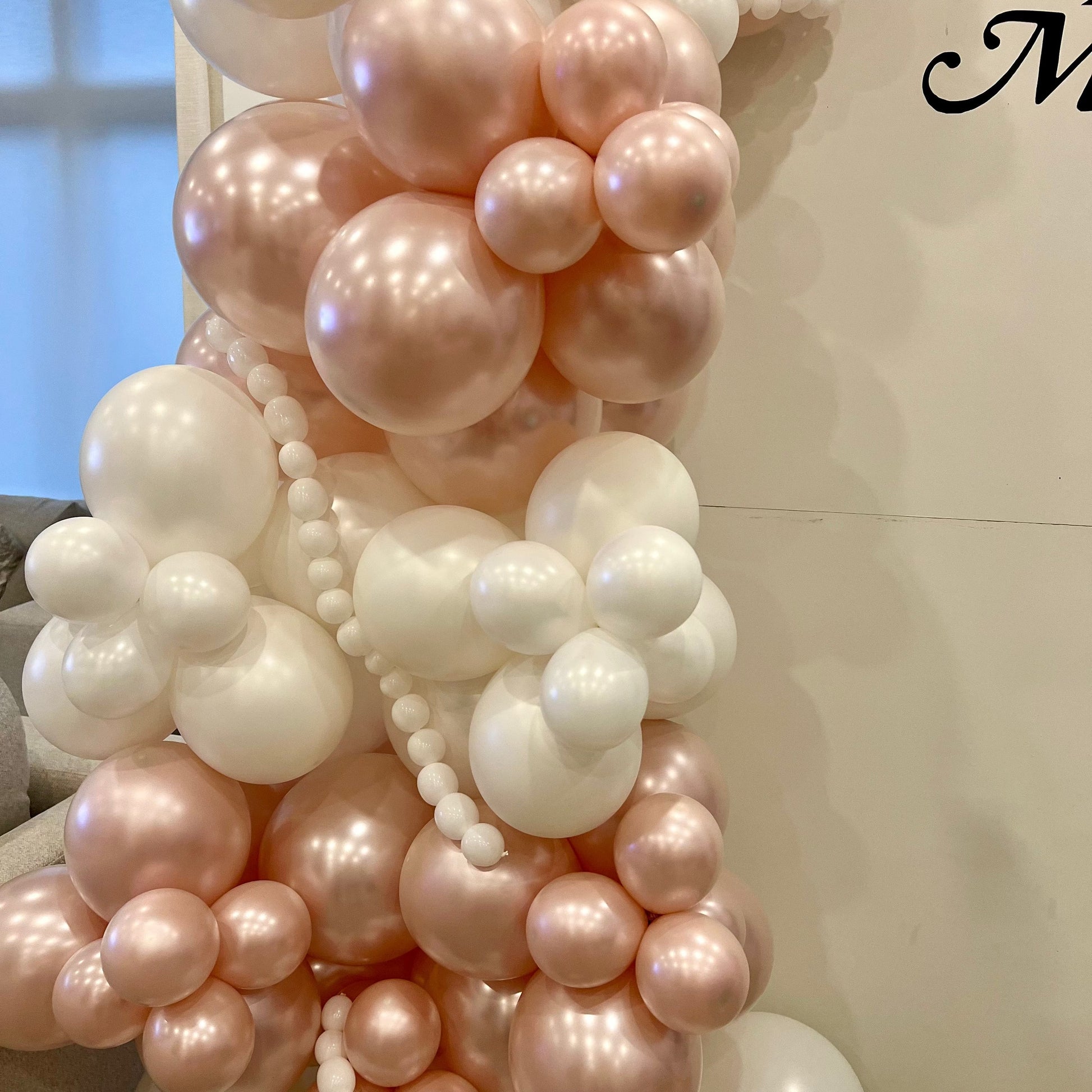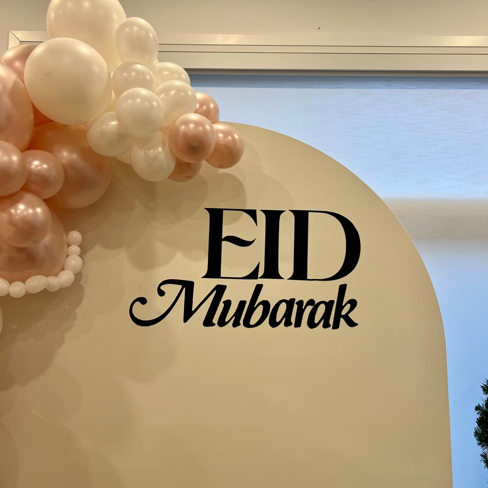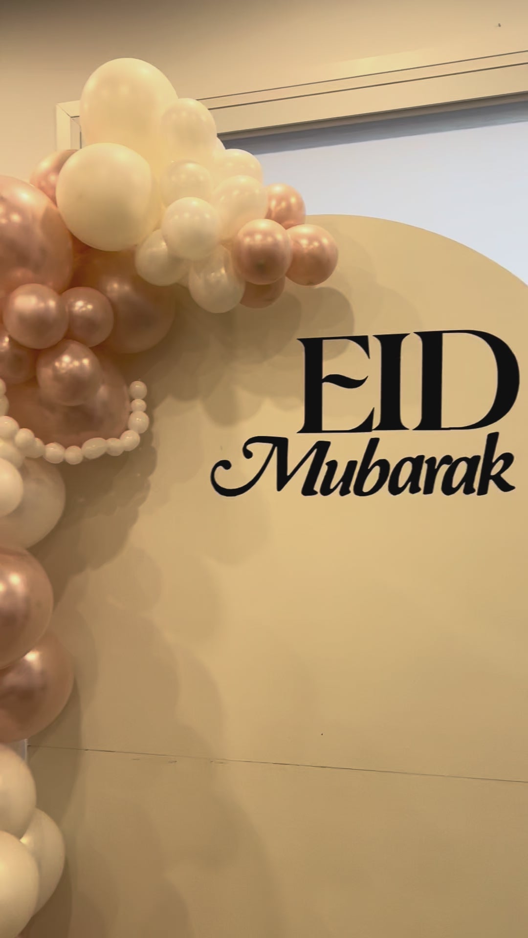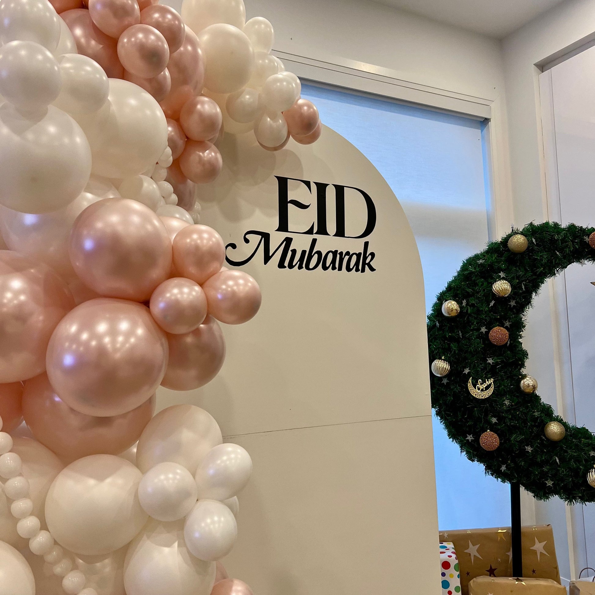 Elegant white oval backdrop (7ft tall x 4ft wide) with one-sided balloon garland in white and pearl pink, finished with a large Eid Mubarak sign.