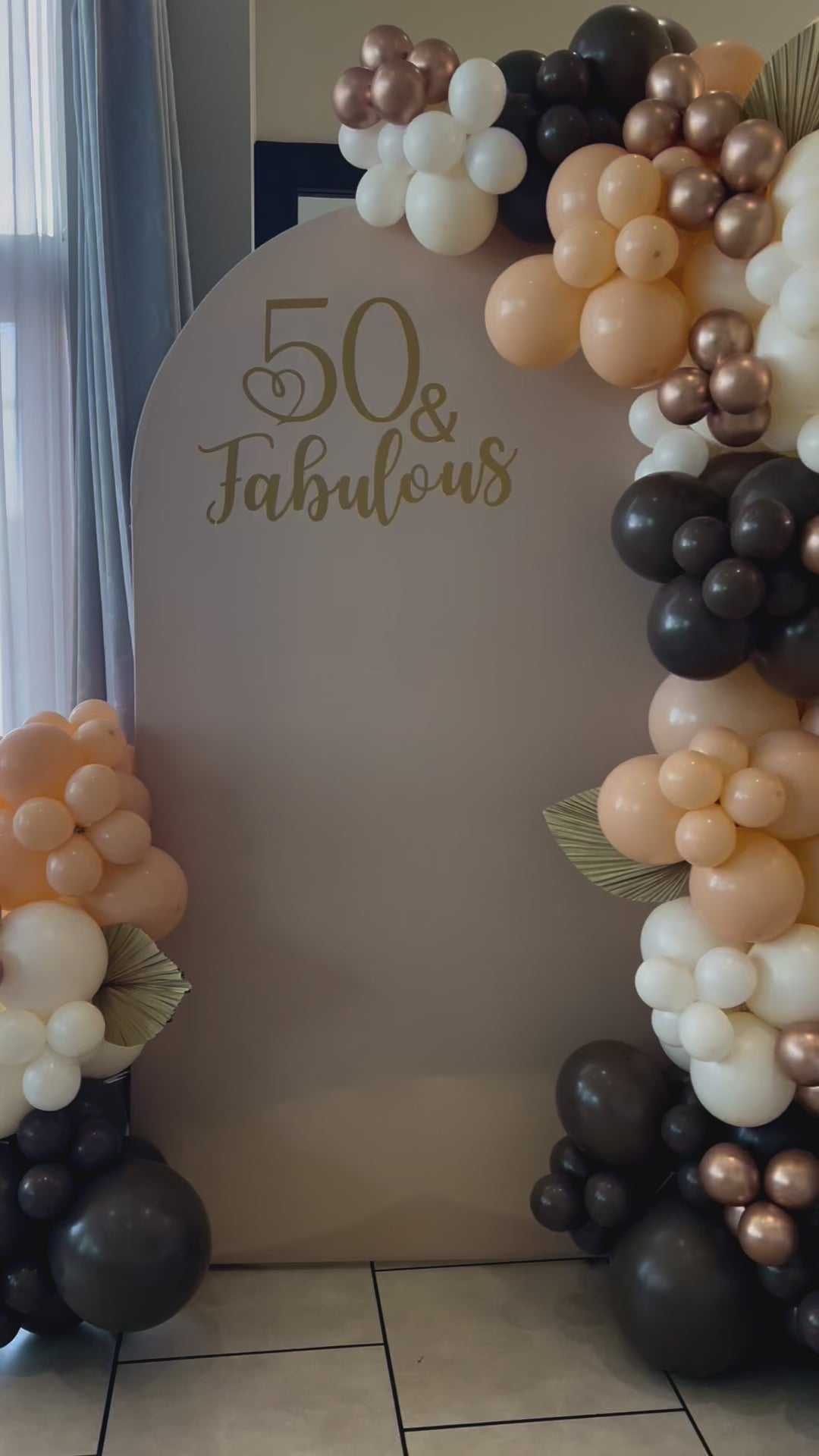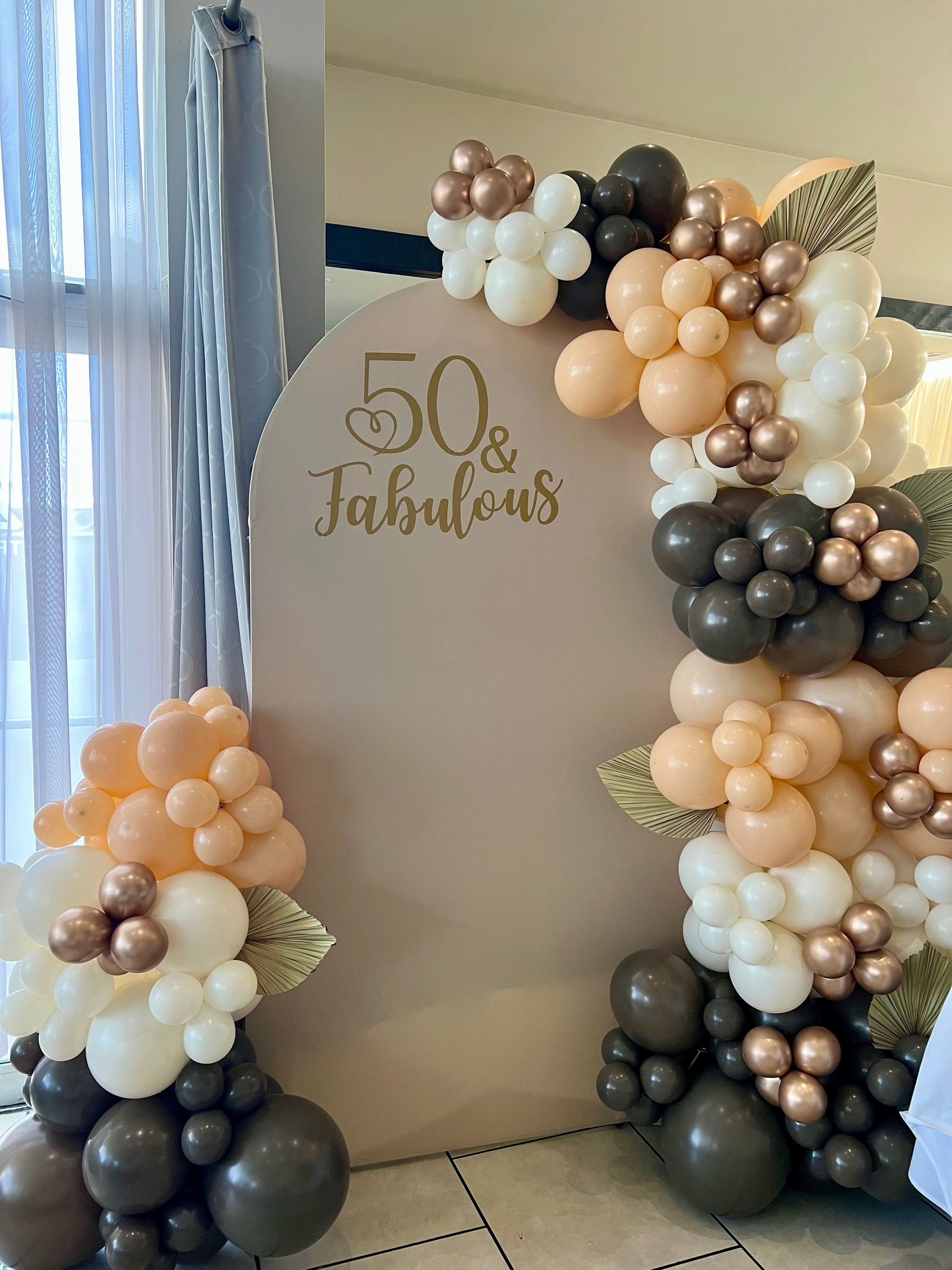 Celebrate the big 5-0 in style with our Fifty & Fabulous Backdrop! This elegant setup features a 7-foot tall by 4-foot wide backdrop adorned with a stylish birthday sign. On each side, you’ll find two balloon garlands—one large and one smaller—tastefully decorated with dry palm leaves and accent elements for a refined, modern look. Perfect for milestone birthdays, this backdrop creates a picture-perfect moment for your celebration.