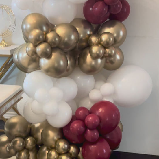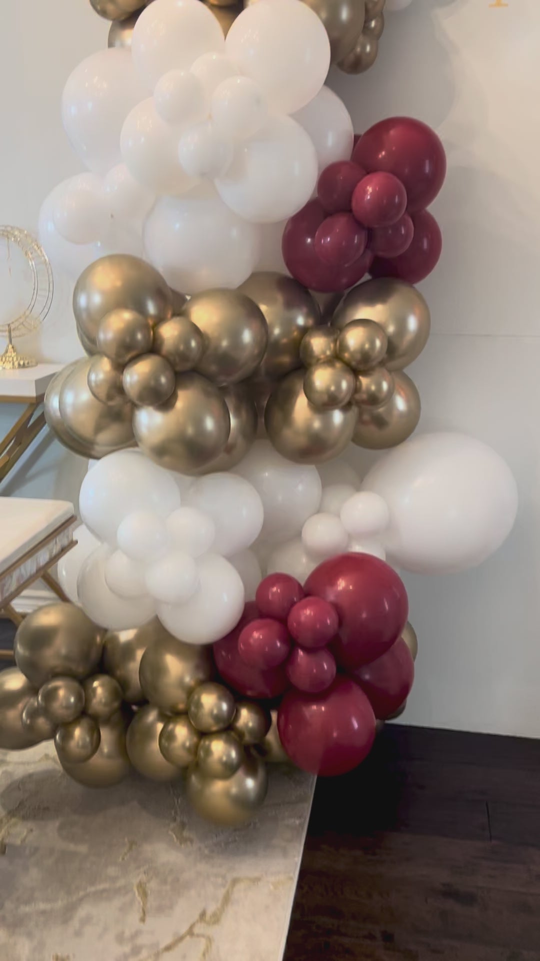 - Balloon garland (white, gold, soft red)