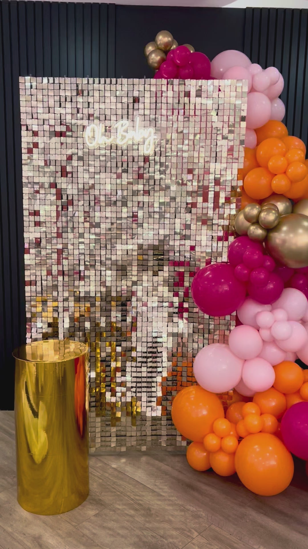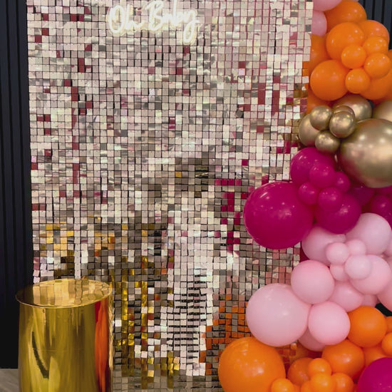 Celebrate your baby shower in style with this elegant Oh Baby setup featuring a light gold shimmer wall that adds the perfect touch of sparkle and sophistication. The design includes a radiant Oh Baby neon sign, a large cascading balloon garland in soft matching tones, and a chic gold cake table — creating a warm, timeless atmosphere for your celebration.