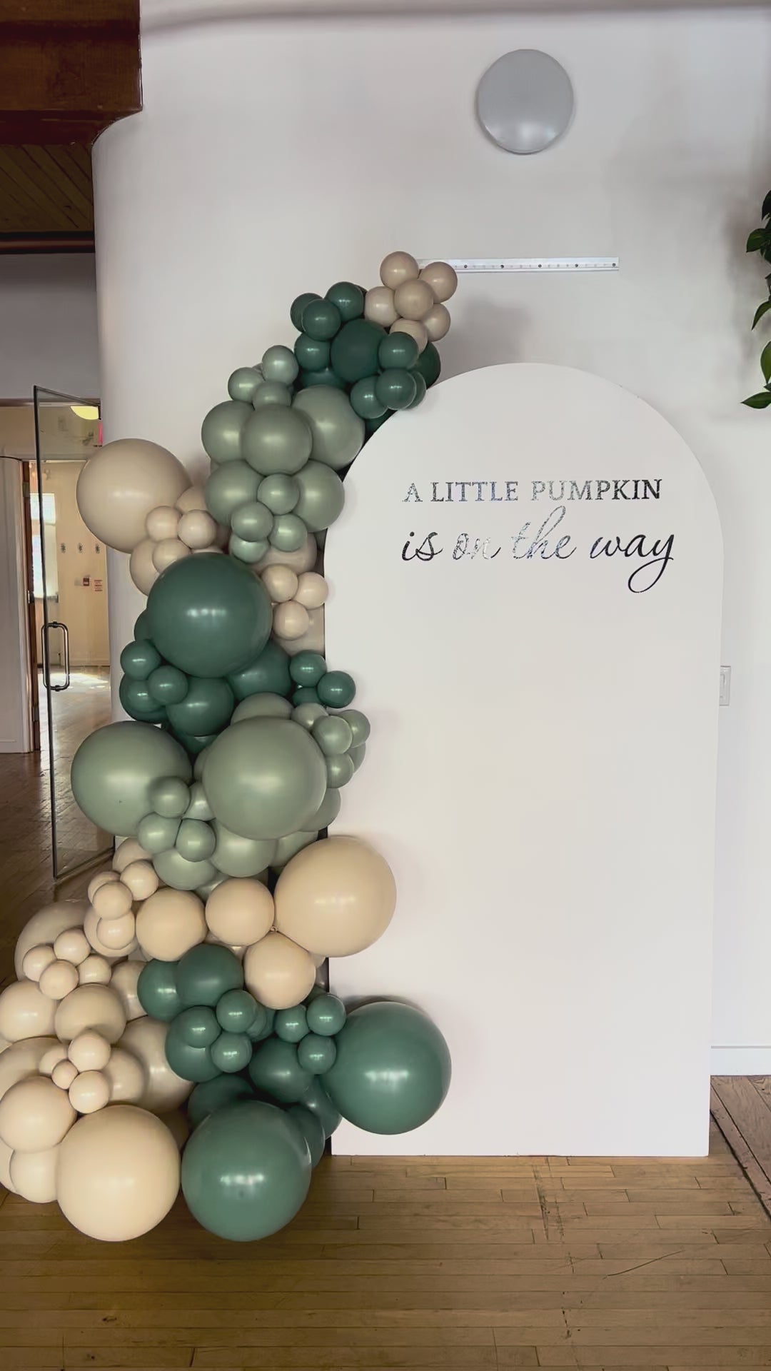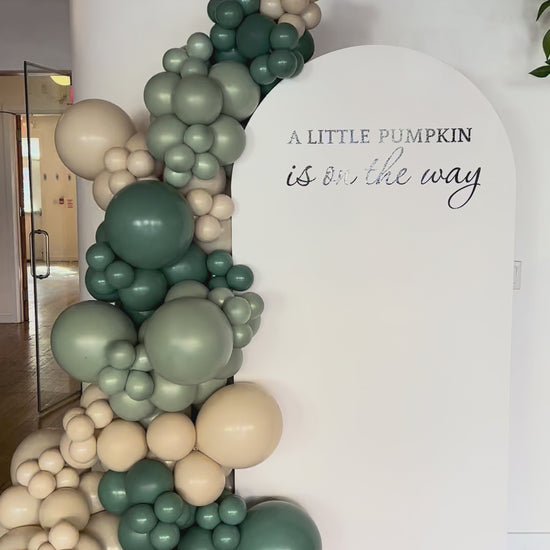 A soft and elegant Little Pumpkin on the Way baby shower setup designed in muted autumn-inspired tones without bright orange accents. It features a white oval backdrop with the inscription Little Pumpkin on the Way and a graceful balloon garland in shades of green, beige, and sage — creating a cozy and natural atmosphere.