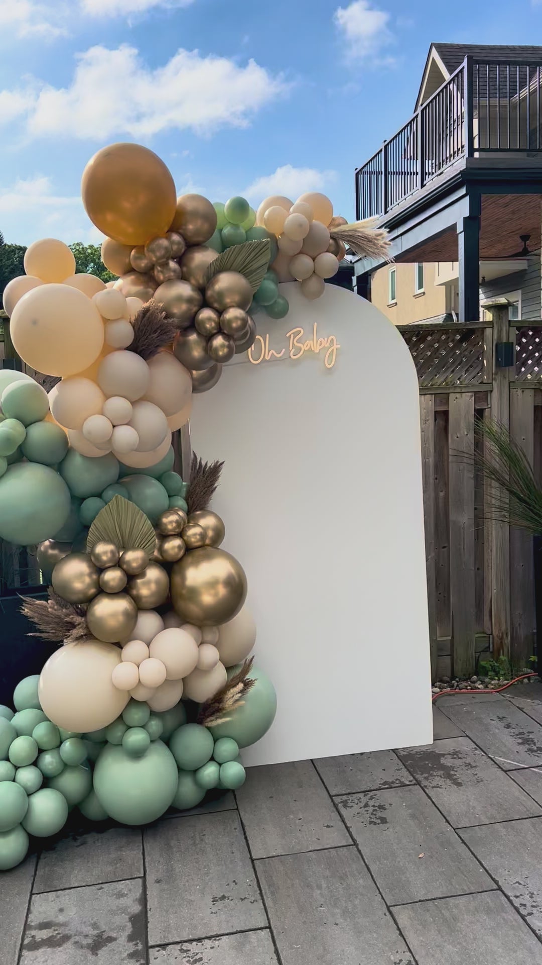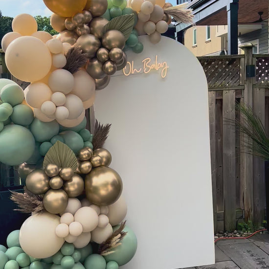 - Balloon garland in beige, gold & sage green tones