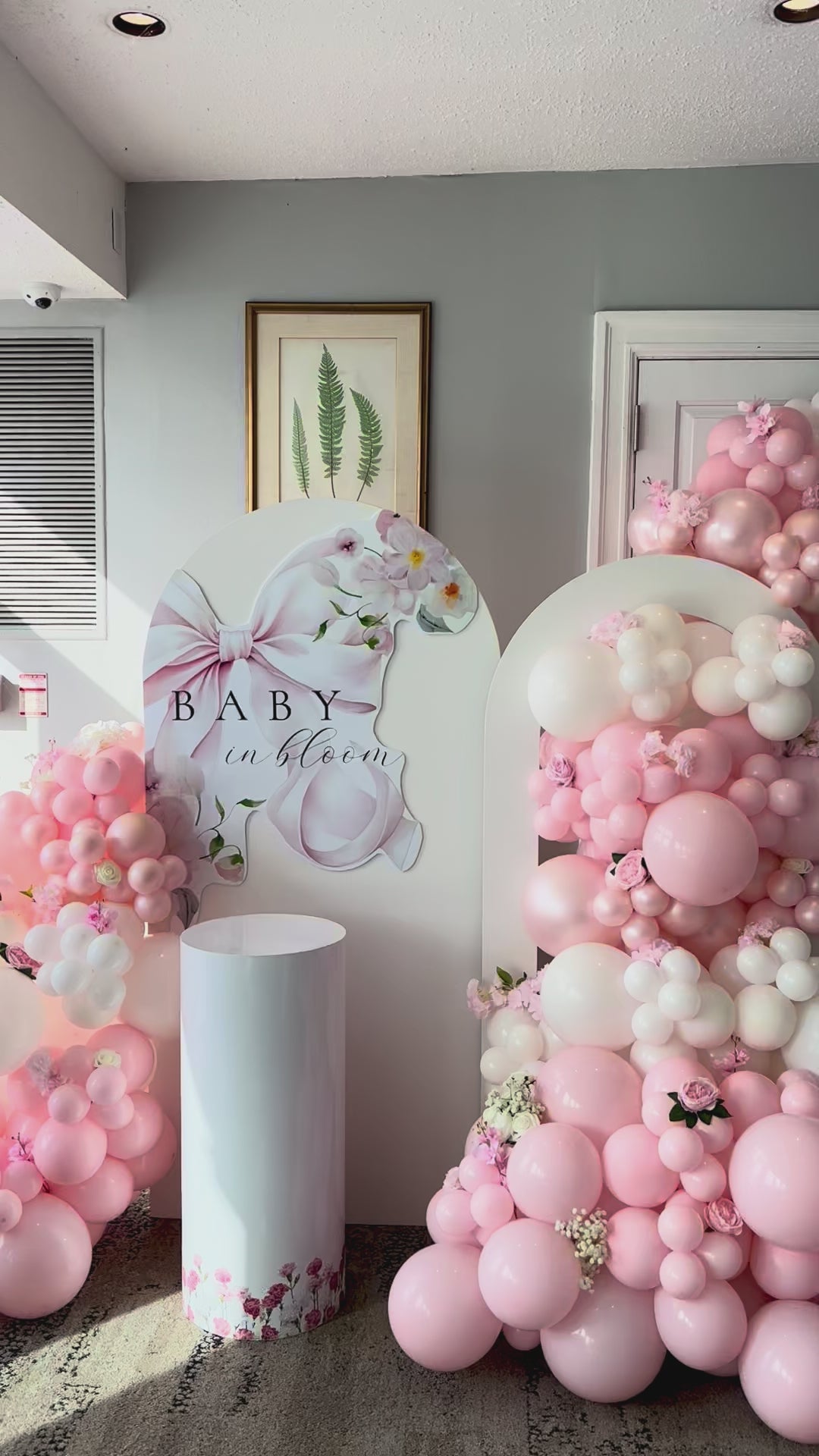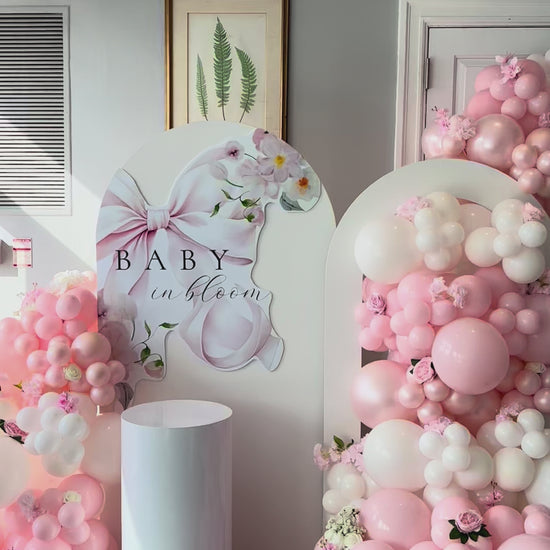 Celebrate your special day with our Pearl Bloom setup — a soft, elegant combination of white, blush, and pearlescent tones. The design includes two white arches (full and hollow) with lush balloon garlands, premium faux florals in white and pink, and a matching white cake table with delicate flower décor. A perfect choice for a refined and feminine baby shower.