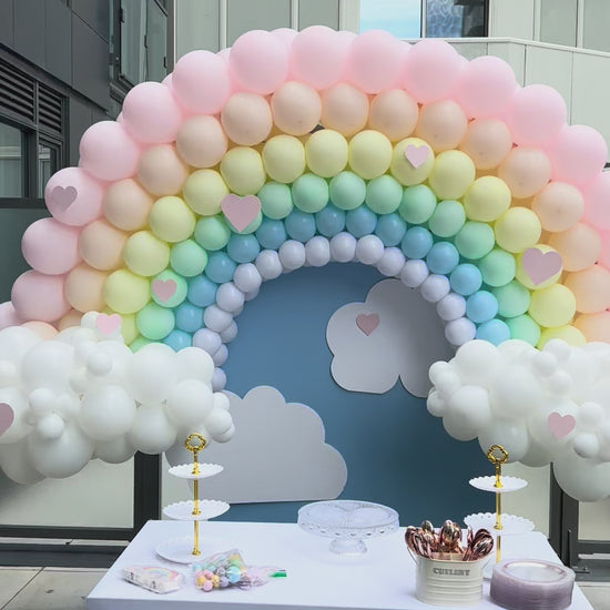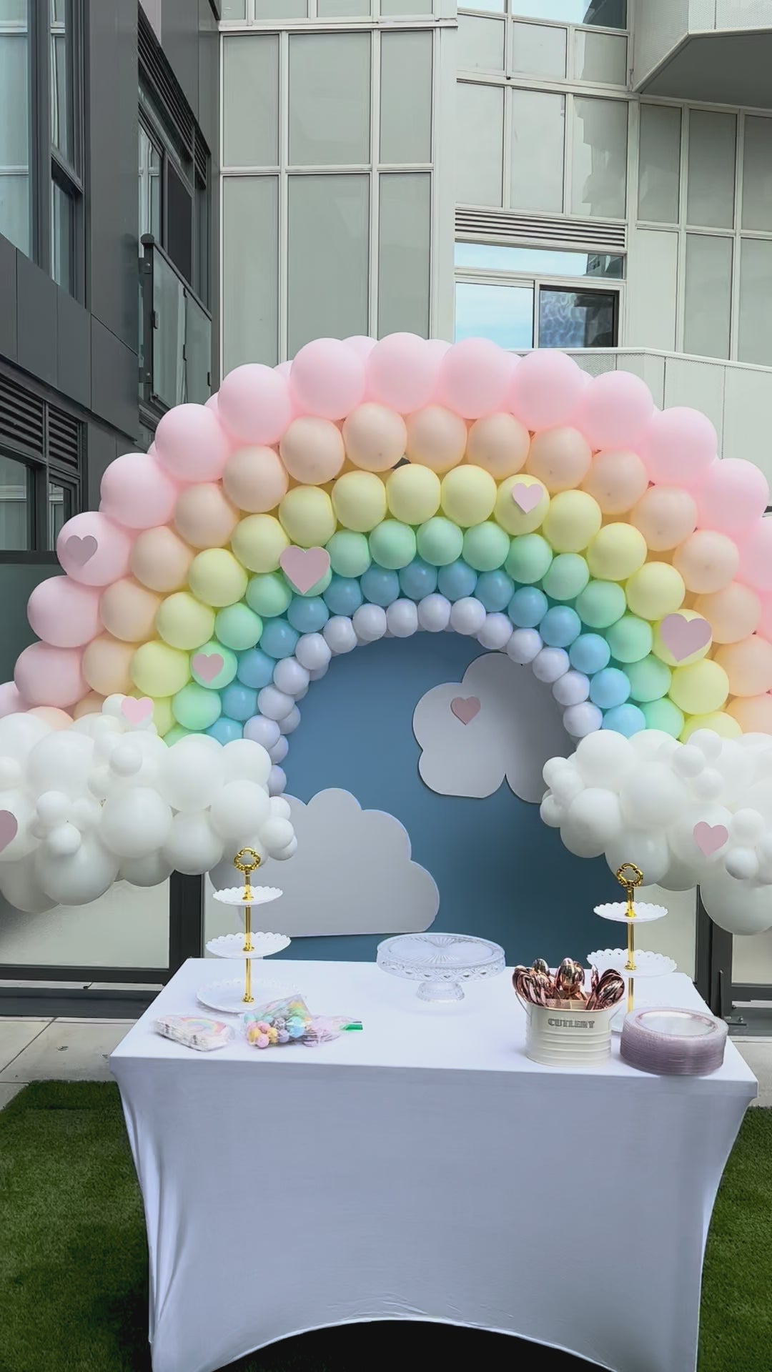 Bright, dreamy, and full of joy — this Rainbow Baby Shower setup is designed to bring a magical touch to your celebration. A soft blue backdrop sets the sky-like scene, beautifully styled with a pastel rainbow resting on fluffy white clouds, surrounded by small cloud and heart accents.