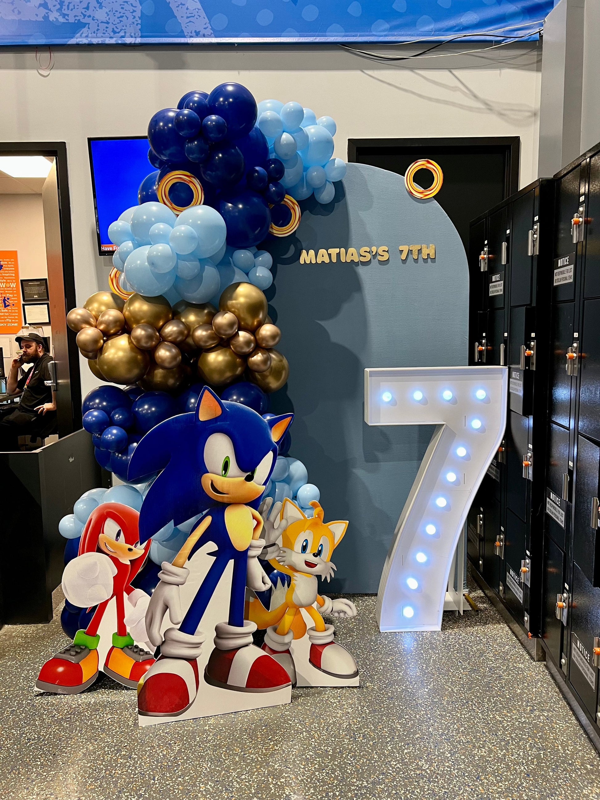 Designed in classic Sonic colors — blue, red, yellow — this setup will add fast-paced fun to your celebration!