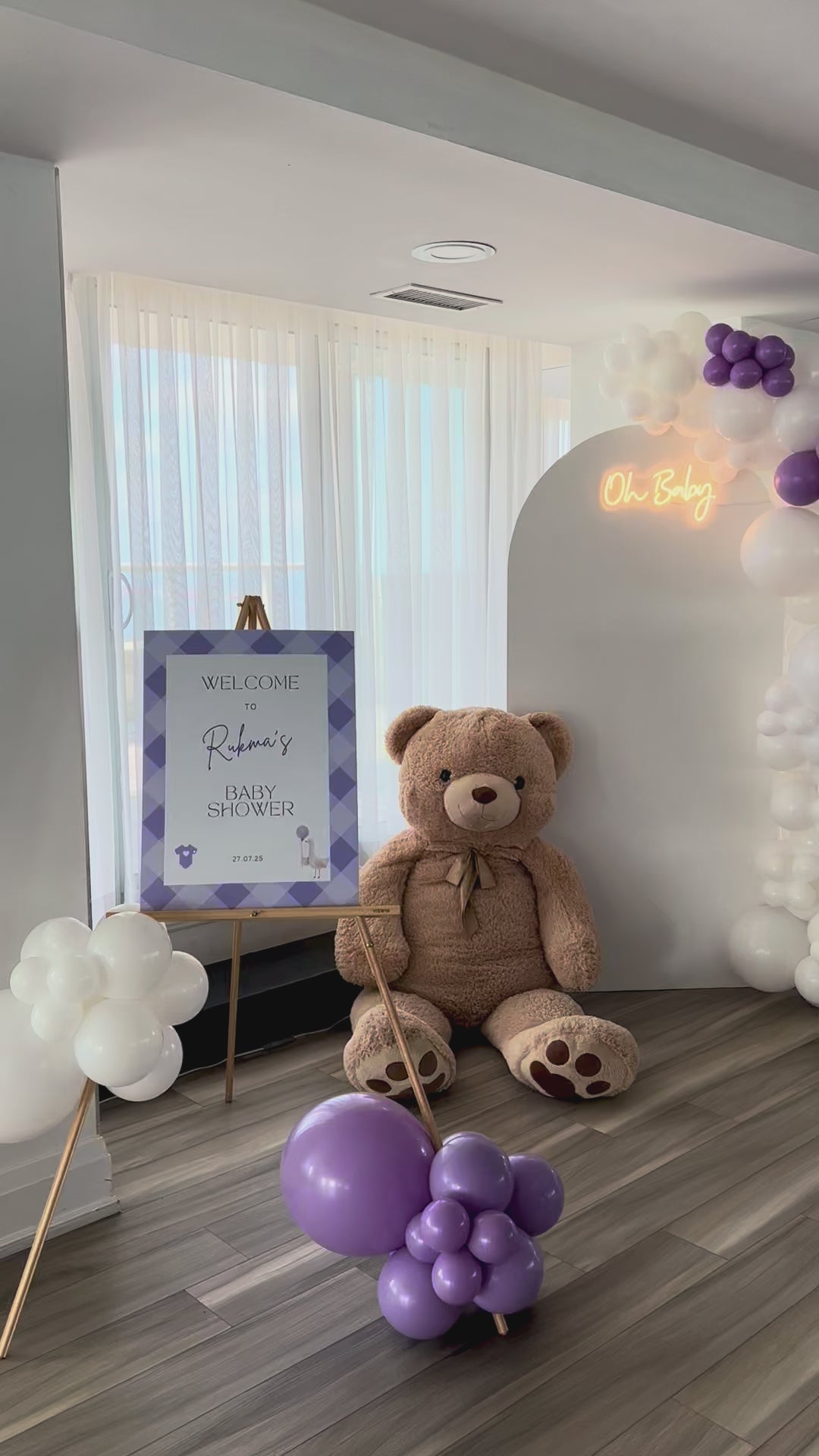 The main setup features a white oval backdrop with a large balloon garland in white and lilac tones, paired with a glowing Oh Baby neon sign and an adorable oversized teddy bear accent. Together, they create a warm and playful atmosphere that’s perfect for photos and celebrations.