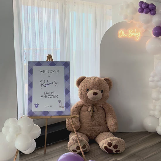 A sweet and modern Teddy Bear–themed setup, perfect for welcoming your little one in style. This décor includes two matching zones — a charming welcome sign on an easel with balloon clusters, and the main backdrop area designed to impress.